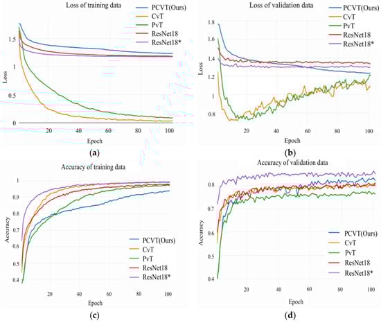 Iterative curves of CvT, PvT, ResNet18, ResNet18*, and PCVT on the RAF-DB dataset. (a) Loss plots of these five networks on the training data of RAF-DB. (b) Loss plots of these five networks on the validation data of RAF-DB. (c) Accuracy plots of these five networks on the training data. (d) Accuracy plots of these five networks on the validation data. * It represents a pretrained model.