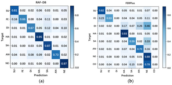 However, the algorithm proposed in this study recommends using a dataset with better balance for training, since the designed classifier sums neutral emotion features with weights with other emotion features for classification. Unbalanced sample sizes will affect the model’s ability to extract an unbiased emotion baseline. The RAF-DB dataset is more balanced than the FER+ dataset, so the proposed method achieves the highest accuracy on the RAF-DB dataset, as shown in Table 6 and Figure 7. However, its performance on the FER+ dataset is weaker than other FER algorithms, such as RAN [29], VTFF [34], SCN [47], and FER-VT [48].