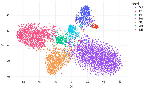The clustering ability of FER-PCVT on the RAF-DB dataset is visualized by the t-SNE plot based on the inputs and outputs of the last linear layer of V-ALC. As shown in Figure 8, the boundaries between the various categories are clear and intuitive, which means that FER-PCVT can distinguish and cluster the seven emotions well.