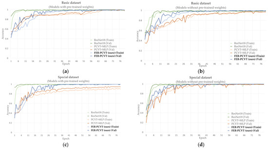 Training and validation accuracy curves of ResNet18, PCVT+MLP, and FER-PCVT on the facial expression dataset of stroke patients. (a) Accuracy curves for models with pretrained weights on the basic dataset; (b) accuracy curves for models without pretrained weights on the basic dataset; (c) accuracy curves for models with pretrained weights on the special dataset; (d) accuracy curves for models without pretrained weights on the special dataset. Among them, “Train” means training, and “Val” means validation, and the bold font indicates the algorithm proposed in this study.