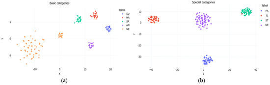 The t−SNE of FER-PCVT on the private dataset. (a) Visualization of the clustering performance of FER-PCVT for five basic expressions; (b) Visualization of the clustering performance of FER-PCVT for four special expressions. SU: surprised; HA: happy; SA: sad; AN: angry; NE: neutral; PA: painful; TI: tired; ST: strained.
