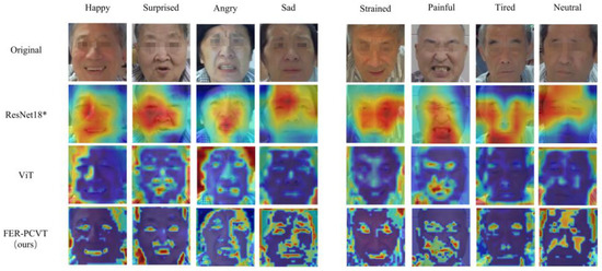 We perform a global visual analysis of models to find the regions that models focus on for classification. The Grad-CAM [52] is used to visualize ResNet18*. For ViT and FER-PCVT, visualization is achieved by stacking the attention weights of each layer in order. ResNet18*, ViT, and FER-PCVT have different focus points when identifying the facial emotions of stroke patients, as shown in Figure 11. The part covered in red is the region of the model’s most concern when classifying and recognizing expressions. ResNet18* focuses on localized facial regions, while ViT extracts information globally. Although the red regions in the visualization images of ViT appear more on the periphery of the image, ViT also pays attention to the details of the facial features. However, FER-PCVT can focus more on muscle changes due to different expressions while extracting global information. For example, for strained expression, a common emotion when muscles are tense during training, FER-PCVT notices more changes in areas such as eyebrows, eyes, and lips than in other models. Moreover, the facial features of neutral expressions extracted by FER-PCVT are more specific than those of other models. In addition, FER-PCVT also showed a better ability to extract emotional features for these four basic expressions.