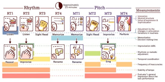 Musical performance has been defined by a number of diverse musical capacities. These include sight-reading (performing unfamiliar music from notation), performing well-prepared pieces from memory or from notation, improvising, playing by ear (performing music from aural presentation) and singing familiar and unfamiliar melodies [1,9,10,90,91,92]. Musical performance depends on accurate timing ability [93], metrical structure and on the organization of a piece of music [94,95]. The accuracy of pitch and intonation is of major importance to maintain the harmonicity and the aesthetic quality of a musical performance [96]. Although most musical measurements used in the scientific context differ as to the underlying concept of musicality [97], rhythm and pitch are two of the main overarching dimensions of music [98]. In this context and based on previously used musical production tasks [99], we developed a musical performance measurement, the Music Performance Assessment Scale (MuPAS), which focuses on two dimensions: pitch accuracy and rhythmic ability.