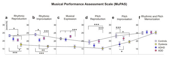 The tables and precise values of the post hoc comparisons of the variables of musical performance are contained in the Supplementary Materials (see Table S8) and are summarized in Figure 2 below. The findings illustrate the mean value differences of the six music performance measures between the diagnoses groups with ADHD, ADD and dyslexia and the control groups. The results revealed that the control group, the ADHD group and the ADD group performed better than the dyslexic group in the rhythmic reproduction, rhythmic improvisation and musical expression tasks. In rhythmic reproduction, the controls scored higher than the ADD group, and in rhythmic and pitch improvisation, the controls performed significantly better than the ADHD group. Adolescents with ADD and controls scored higher in pitch reproduction than the dyslexic group. Only in pitch improvisation did the ADD group outperform the ADHD group, while only the controls scored higher in pitch improvisation than the dyslexic group.