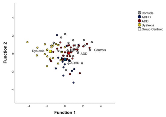 Therefore, if an arbitrary cut-off of 0.50 is used to decide which of the standardized discriminant coefficients are large, rhythmic improvisation and musical expression discriminate the groups best. The discriminant plot revealed that the first function separated the dyslexic group from the other three groups quite well (see Figure 3). Table S9 in the Supplementary Materials shows all the correlations between the outcomes and the discriminant functions in more detail. In consideration of the results, the discriminant analysis revealed that the rhythmic improvisation and musical expression task variables discriminate the groups best, which is why we discuss them in more detail in this paper.