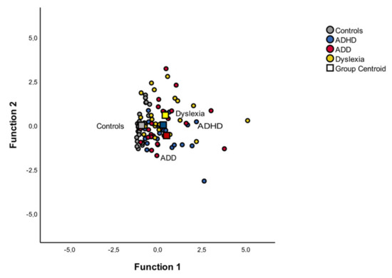 Discriminant function of the MEG variables. Function 1 discriminates the controls from the dyslexic, ADD and ADHD groups, while the second function discriminates the dyslexic group from the control, ADD and ADHD groups. The correlations between the outcomes and the discriminant functions revealed that the loads onto the first function are high for the absolute P1 latency asynchrony |R-L| (r = 0.97), while the correlations between the outcomes and the discriminant functions revealed that the loads onto the second function are high for P1 latency right and left (mean) (r = 0.82) and for N1 latency right and left (mean) (r = 0.68).
