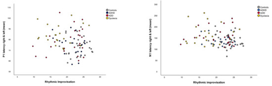 Correlation plots of rhythmic improvisation with P1 latency right and left (mean) and N1 latency right and left (mean). Better rhythmic improvisation is associated with early P1 and N1 latencies (mean). Both correlations remain significant after Benjamini–Hochberg correction for multiple testing (p < 0.05).