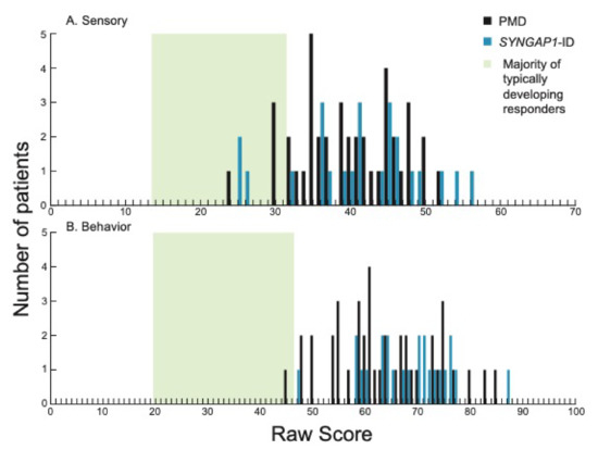 Distribution of scores in each of the two sections on the SSP-2 for PMD and SYNGAP1-ID. Histograms showing number of PMD patients (black) and SYNGAP1-ID patients (blue) with each raw score in the sections of (A) sensory and (B) behavior. Green box indicates range of scores associated with the majority of typically developing responders based on prior validation of the SSP-2 [24]. PMD: Phelan-McDermid Syndrome. SYNGAP1-ID: SYNGAP1-related Intellectual Disability. SSP-2: Short Sensory Profile-2.