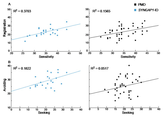 Correlation between sensory areas. (A) Registration and sensitivity scores for SYNGAP1-ID (left, blue) and PMD (right, black) were more strongly correlated than (B) avoiding and seeking scores. PMD: Phelan-McDermid Syndrome. SYNGAP1-ID: SYNGAP1-related Intellectual Disability. SSP-2: Short Sensory Profile-2.