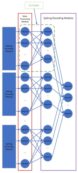 A full connection is adopted for the corresponding cluster in the Main Processing Module and the cluster in the first layer of the Spiking Decoding Module.