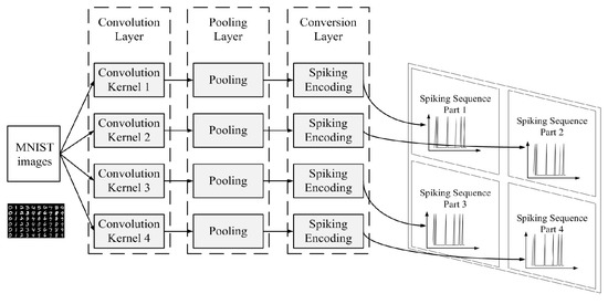 Four convolution kernels are used in the convolution layer. Then, the result of the four convolution kernels would be processed by the pooling layer. Finally, the conversion layer will be used to encode the output of the pooling layer into spiking sequences [31].