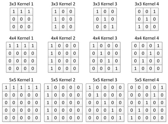 At present, the size of the convolution kernel commonly used in DNN is , , , and the pooling size is , , . So, in this work, we also choose a convolution kernel of , , , and the pooling size is , , . Our research shows that when using convolution kernels with transverse, longitudinal and two cross diagonal weights distributions, the core features of the image can be obtained more clearly. Figure 6 shows the convolution kernels of different sizes that are used in this paper.