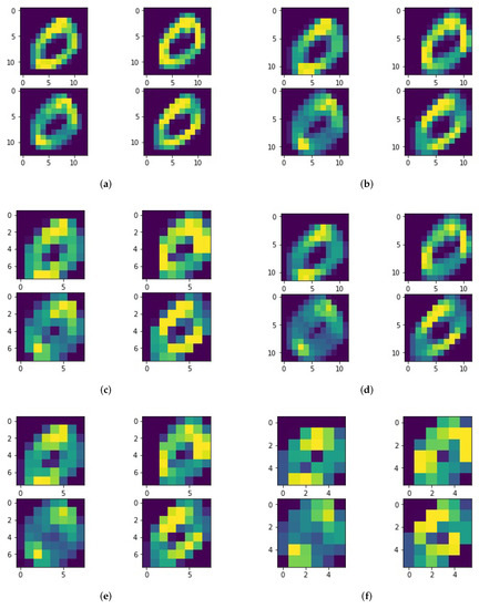Figure 7 shows the result of an image from the MNIST data-set which is labeled as a ‘0’ after the process of different configurations of the convolution layer and the pooling layer. The convolution layer includes four different convolution kernels (transverse, longitudinal and two cross diagonal weights distribution) of the same size, which is declared under each sub-figure. The moving step of the convolution kernel is 1. The size of the pooling layer is also declared under each sub-figure.
