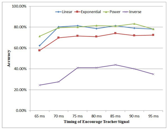 Figure 10 shows the influence of different timings of the punishing teacher signal on accuracy. It could be seen that, with the exception of the inverse encoding method, when the timing of the punishing teacher signal is arranged between (5 ms, 35 ms), the accuracy is not affected very much. Therefore, we set the timing of the punishing teacher signal at 35 ms in this work.