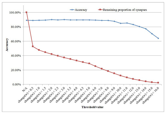 It can be seen from the result that structural learning can not only improve the accuracy, but it also greatly reduces the complexity of the network in terms of the huge reduction in the number of synapses, as shown in Table 1. Only when the threshold of weight change has been set to larger than 10.0 would there be a gradual drop in accuracy. If we set the threshold of weight change as 9.0, then we could use a network of only 13,161 synapses to gain an accuracy of 88.80%, which is only slightly less than the accuracy of the network with 100% of the synapses connected, which is 86,400 synapses. Therefore, structural learning can largely enhance structural efficiency.