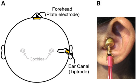 Experimental setup: (A) Electrode montage between a tiptrode inserted in the ear canal and a Jelly Tab plate electrode on the forehead. (B) Picture showing the gold-plated tiptrode and the sound delivery black tube.