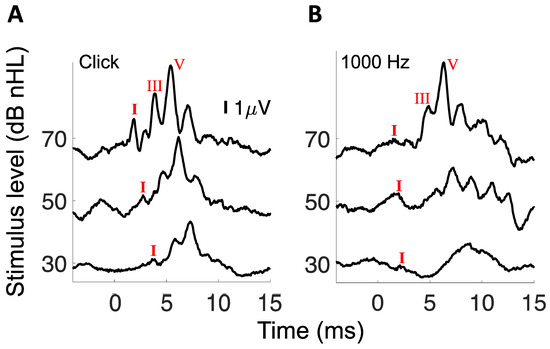 (A) Sample ABRs to clicks. (B) Sample ABRs to 1000 Hz tone bursts. Wave I was labeled for all waveforms while wave III and V are labeled for the 70 dB nHL stimulus only.