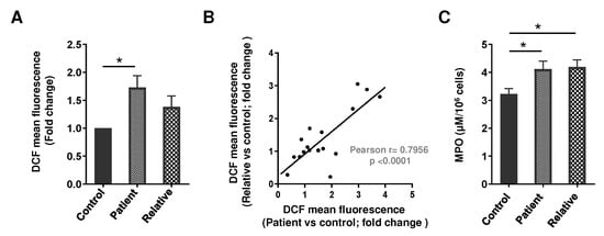 (A) Free radical generation (DCF mean fluorescence) in the PMNs of drug-naive depression patients, their first-degree relatives, and healthy volunteers (depression patients n = 20, first-degree relatives n = 18, healthy controls n = 18). DCF mean fluorescence in the PMNs of the healthy control was considered as 1 to calculate the fold change. F (2, 53) = 4.618; * p < 0.05. (B) Correlation in the ROS levels in the PMNs between patients and first-degree relatives. (C) MPO activity in the PMNs of drug-naive depression patients, their first-degree relatives, and healthy volunteers (depression patients n = 18, first-degree relatives n = 16, healthy controls n = 15). F (2, 46) = 4.274; * p < 0.05. (A,C) Data expressed as mean ± SEM.