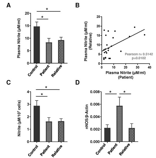 (A) Total nitrite content (assessed by a modified Griess assay) in the plasma of drug-naive depression patients (n = 27), their first-degree relatives (n = 24), and healthy volunteers (n = 26). F (2, 74) = 4.953; * p < 0.05. (B) Correlations in the plasma nitrite content between depressive patients and their first-degree relatives. (C) Total nitrite content (assessed by a modified Griess assay, healthy controls n = 27, depression patients and first-degree relatives, n = 18 in every group) F (2, 60) = 4.422; * p < 0.05, and (D) nNOS mRNA expression as analyzed by a real-time PCR using β-Actin as an internal loading control in the PMNs of drug-naive depression patients, their first-degree relatives, and healthy volunteers (depression patients n = 22, first-degree relatives n = 21, healthy controls n = 22). F (2, 62) = 4.709; * p < 0.05. (A,C,D) Data expressed as mean ± SEM.