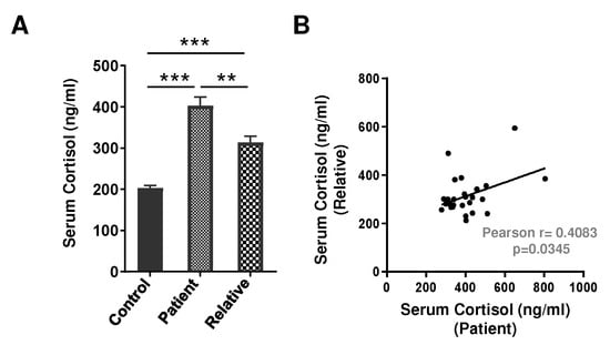 (A) Serum cortisol level in drug-naive depression patients (n = 29), their first-degree relatives (n = 27), and healthy volunteers (n = 24). Data expressed as mean ± SEM. F (2, 77) = 36.23; ** p < 0.01 and *** p < 0.001. (B) Correlation in serum cortisol levels between patients and their first-degree relatives.