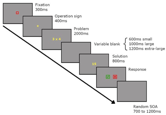 In total, 480 problems (96 in each condition) were presented randomly in blocks of 48 trials (10 blocks). A trial would start with a red fixation box for 300 ms, then an operation sign (- or x) appeared for 400 ms before the problem was presented (Figure 1). This was done to avoid interference due to switching between operations [,]. The problem remained on the screen for 2000 ms and was replaced by a blank screen of variable duration. The duration was 600 ms for small problems, 1000 ms for large problems and 1200 ms for extra-large problems to provide participants with enough time to retrieve or calculate the solution. Next, a proposed solution was presented for 800 ms, for which participants only had to decide if it was accurate or not and hold their response to avoid motor components. On the following screen, a green check and red cross appeared until participants gave their responses. Participants pressed the key ipsilateral to the green check if they thought the proposed solution was accurate or by pressing the key ipsilateral to the red cross if they thought the answer was wrong. The side of appearance for the green check and red cross was counterbalanced and random to avoid motor preparation related to the response production. The trial was then followed by a blank screen with a random duration between 700 and 1200 ms (i.e., SOA).