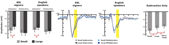 For the operation type by problem size by group analysis, we only found the main effect of group where ASL signers showed greater negativity compared to English-speaking participants (F(1, 62) = 9.83, p = 0.003, η2p = 0.14; −0.77 μV vs. −0.05 μV for ASL signers and English speakers, respectively).
