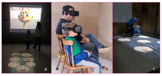 Over the past decades, immersive virtual reality has been widely used for enhancing communication and social skills in safe and controllable yet ecological contexts. Children with ASD exposed to such interventions have shown improvements in nonverbal communication, initiative, and social cognition [48]. In addition, technologies can offer to pairs or small groups of children innovative activities that are designed to create a cooperative environment in which they learn not only from the adult but especially from their playmate. Collaborative virtual environments (CVEs) can be used with children with ASD to enable several users to remotely interact with the environment at the same time. Each person is represented by their unique avatar, acting, moving and navigating the environment independently, thus communicating directly when they are close enough to another user’s avatar [49].