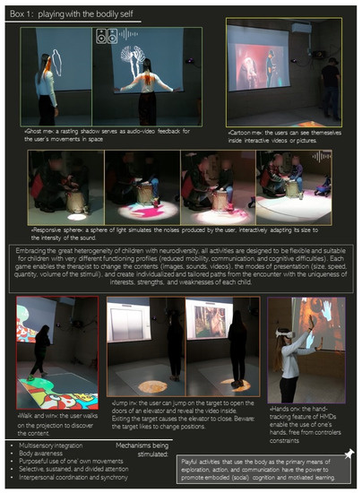 A fascinating approach to stimulate these processes in children with ASD is to retrace, support, and scaffold the underlying developmental processes. We see in the box (Figure 2) some practical examples of the digitally aided activities we have designed in this direction over the course of six years of workshops with children and families. Our NUIEVE laboratory has been raised from the scientific, clinical, technical, and artistic collaboration of a multidisciplinary team of experts in the fields of developmental cognitive neuroscience, new multimedia technologies, visual arts, and music (https://www.facebook.com/NUIEVE/, accessed on 20 January 2022). Although ASD is one of the most frequent diagnoses received by children who have attended and attend our workshop, our activities have developed from the encounter with the uniqueness of interests, strengths, and weaknesses of each child. For this reason, and with the awareness of the great heterogeneity of children with neurodiversity, all activities are designed to be flexible and suitable for children with very different functioning profiles. We have interfaces designed for children with reduced mobility (i.e., enabling them to interact while sitting, laying on the floor), communication skills (i.e., providing opportunities to control the environment through movement and vocalizations), and cognitive abilities (leveraging procedural and intuitive learning that do not require understanding of verbal instructions). Each game leaves to the operators the possibility to change the contents (images, sounds, videos), the modes of presentation (size, speed, quantity, volume of the stimuli), and to create individualized and tailored paths.