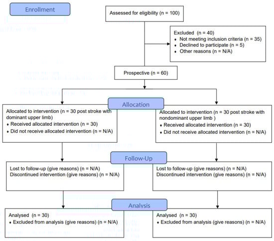 In total, 100 people were examined before inclusion. Forty people were excluded; 35 patients were excluded because of their functional condition, and 5 declined to participate. Finally, 60 study participants were prospectively placed into two groups: 30 post-stroke with a dominant upper limb and 30 with a non-dominant upper limb (Figure 1).