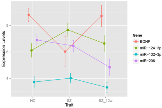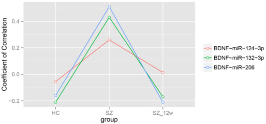 Previous gene expression studies of SZ typically tested the expression levels of either particular genes or particular miRNAs, while co-expression changes between genes and their binding miRNAs have rarely been examined. Here, we investigate the co-expression patterns between the BDNF-encoding mRNA and its regulatory miRNAs, miR-124-3p, miR-132-3p, and miR-206 in 48 healthy controls as well as 32 SZ patients before and after 12-week of the antipsychotic treatment.