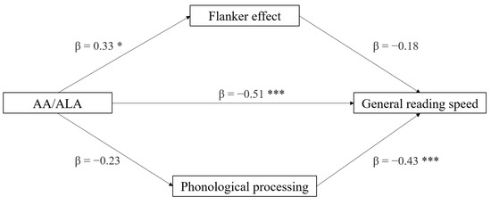 Mediation model with general reading speed (z-score) as the dependent variable, LA/ALA ratio as the independent variable, and neuropsychological variables as mediators (* p < 0.05, *** p < 0.001, one-tailed).