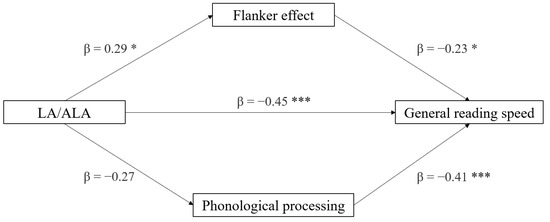 The second mediation model tested the roles of the same mediators in the effect of the LA/ALA ratio on reading speed (see Figure 2). Additionally, in this case only a direct effect of LA/ALA on reading ability emerged (p < 0.001), whereas the indirect effects were non-significant (p > 0.084). The most significant component predicting reading speed was phonological processing (p < 0.001), followed by the flanker effect (p = 0.033). In addition, the effect of LA/ALA on the flanker effect was significant (p = 0.047). Considering the full regression model, the best predictor of reading speed was LA:ALA (p = 0.001), followed by phonological processing (p = 0.003), and then (not significantly) the flanker effect (p = 0.058). Overall, the regression model was significant (t = −4.03, p < 0.001) (Table 4).