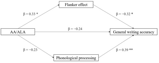 Mediation model with general writing accuracy (z-score) as the dependent variable, AA/ALA ratio as the independent variable, and neuropsychological variables as mediators (* p < 0.05, ** p < 0.01, one-tailed).