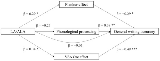 Mediation models with general writing accuracy (z-score) as the dependent variable, LA/ALA ratio as the independent variable, and neuropsychological variables as mediators (* p < 0.05, ** p < 0.01, *** p < 0.001, one-tailed).