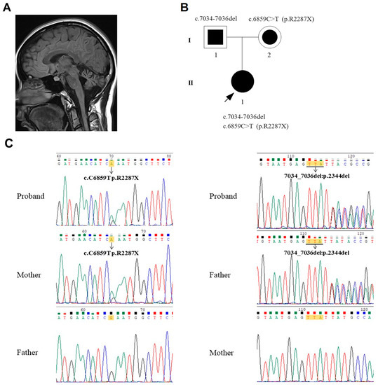 (A) Image of a brain MRI showing cerebellar and brain stem atrophy. (B) Pedigree of the patient’s family. The arrowhead with the closed square indicates the proband (II-1). Semi-closed square (I-1) and circle (I-2) indicate her asymptomatic father and mother, respectively. (C) Sequencing results showed the mutations c.6859C > T (p.R2287X) inherited from the proband’s mother (left) and c.7034_7036del inherited from the proband’s father (right).
