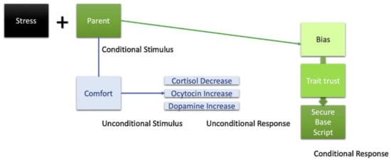 This again presents itself in the work by Dekkers et al. (this issue), where children with ADHD were compared with typically developing children and where, again, the rate of insecure attachment was significantly higher in the ADHD children. Interestingly, in the latter study, within the ADHD group, attachment (in)security was not related to the severity of behavior problems in this group. One explanation that stood out of the discussion was the possibility that children with ADHD failed to learn from care-related interactions with their parents. This interpretation fits with the recently developed learning theory of attachment []. According to this theory, the attachment system and children’s inclination to seek parental support during distress is part of the inborn genetic make-up of all children. However, whether or not children develop (in)secure attachments to their caregivers depends on basic classical and operant learning processes following the logic of safety conditioning (see Figure 1). Specifically, if during distress a parent (a Conditional Stimulus) is frequently paired with comfort and support (an Unconditional Stimulus), this will automatically elicit endocrinological changes (e.g., cortisol decreases, oxytocin increases; an Unconditional Response) which activates secure attachment states or state trust []. Over different learning events, if secure attachment states are repeatedly activated, children gradually develop the expectation that they can rely on parents for support (the Conditional Response). Hence, if secure attachment states are consistently activated, this seems to be linked to more secure trait attachment, whereas if there is more secure state attachment instability, this seems to be linked with decreases in secure trait attachment (Verhees et al., this issue).