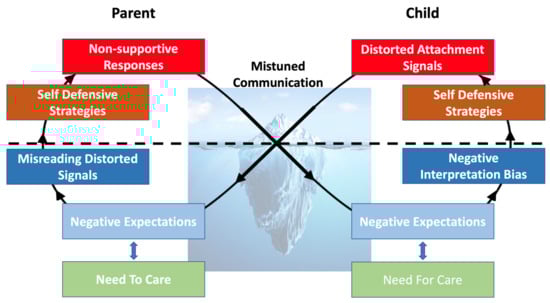 Some 10 years ago, attachment researchers’ attention was drawn to the mechanism question [], wondering what explains the link between insecure attachment and the development of psychopathology. A recently proposed model suggests that symptoms of psychopathology are the result of dynamic parent–child interactions that set off insecure cycles of interaction []; Figure 2. Insecure cycles are activated when children display distress followed by miscommunication, which means that children have the impression that parents do not respond sensitively to their distress. These miscommunications activate memories of past learning events during which children felt rejected or not supported. These activated insecure attachment states bias their processing of the attachment-relevant information in their environment due to which they will interpret their attachment environment as even more rejecting and which activates (fears for) negative emotions against which children will try to protect themselves. The more anxious or more avoidant self-defensive strategies they will then rely upon will eventually result in behavior that is in fact a distorted signaling of underlying attachment-related needs and fears. These behaviors trigger in the parent the fear of being an inadequate parent, unable to support their children’s development, or feelings of being unloved by the child. As a result, parents sometimes merely see the child’s distorted behavior and act on the appraisal that to save the child and their relationship with the child, the child’s (“mis”)behavior needs to be stopped. Therefore, parents use the (anxious or avoidant) self-defensive strategies they developed as a child to stop these behaviors. These are strategies parents rely upon to cope with their own fears of rejection and lack of support they feel now as a parent. These strategies eventually lead to behavior aimed to stop the pain caused by the child’s behaviors, but this behavior is perceived as “insensitivity” as it ignores the child’s underlying attachment needs and fears. Therefore, what once was a good coping when parents were children themselves, now interferes with their desire to be good parents for their own children. This activates the insecure cycle again in the child and can eventually lead to children displaying behaviors that are considered pathological.