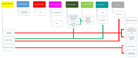 Linkage among QoL domains more represented in the parents’ focus discussion on their experience with health and social services. Colored boxes represent the eight domains of the QoL theory. White boxes represent the QoL indicators confirmed by the coding of the meaning units, and the new indicators or sub-themes (italics) that emerged by content analysis. Rows are positive (green) and negative (red) relationships between themes, as extrapolated by content analysis. Their thickness indicates the frequency of quotation in the text.