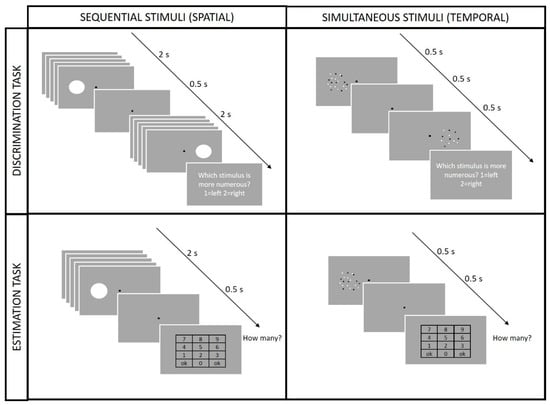 Visual stimuli were generated using the Psychophysics Toolbox in MATLAB (version 3.0.15, The Mathworks, Inc., Natick, MA, USA). Stimuli were presented on a CRT monitor (Barco—model CID 421Calibrator Line, Barco, Inc., Kwun Tong, Hong Kong) with a resolution of 1280 × 1024, corresponding to 41° × 31.2° for the visual angle from a viewing distance of about 57 cm and with a refresh rate of 100 Hz. The background of the screen was always gray (RGB: 125 125 125). The experiment included discrimination and an estimation task tested in separate sessions. In both tasks, two sets of stimuli were used, defining two experimental conditions. In one condition, we used stimuli presented sequentially (temporal numerosity), whereas in the other condition, we used stimuli presented simultaneously over a region of space (spatial numerosity). Sequential stimuli were structured as a series of briefly presented white discs with a diameter of 10°. In each sequence, individual stimuli were presented for 40 ms each, with a variable inter-stimulus interval (ISI) depending on the stimuli numerosity, with only the constraint of the minimum ISI lasting as a single impulse (40 ms). The overall duration of an entire sequence was 2 s. One sequential stimulus was presented in each trial in the estimation task, with numerosity ranging from 3 to 20 flashes. In the discrimination task, we presented two sequences for each trial: a reference sequence always including 12 flashes, while the numerosity of the test sequence was determined adaptively by a QUEST routine on a trial-by-trial basis. QUEST is an adaptative algorithm that uses a Bayesian approach to set the new test numerosity using all the information available from previous trials, supplemented by prior knowledge from the literature and previous experiments []. The numerosity range was set between 4 and 24.