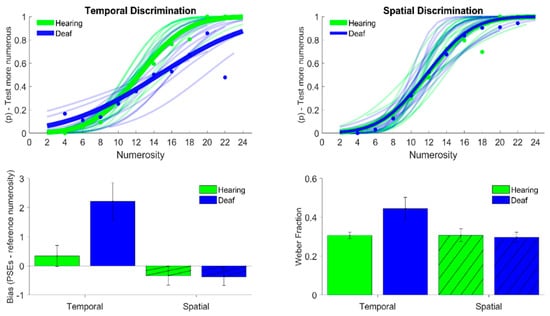 The top panels show the psychometric functions for the discrimination task for both temporal (on the left) and spatial (on the right) numerosity. The functions represent the cumulative Gaussian (psychometric) fits to the proportion of trials in which participants judged the test stimulus as more numerous against the difference in numerosity between the test and the reference. The bold data points and curves indicate the average psychometric fit across participants, while light colors indicate single-subject data. The bottom-left panel indicates the average bias, defined as the difference between the PSE and reference values, while the bars on the bottom right panel indicate the average Weber fractions. Both for the bias and the Weber fraction, the plain bars indicate the temporal task, while the hatched bars indicate the spatial task. Finally, data for hearing participants are shown in green, while data for the deaf group are shown in blue. Error bars represent ±1 SEM.