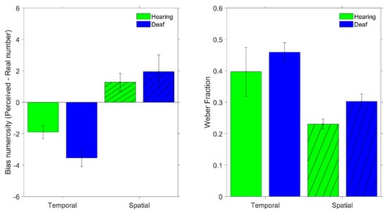 According to the cross-sensory calibration theory [,,,,], during development, the sensory modality that has the highest sensitivity in a specific domain calibrates the other senses. Namely, during development, vision calibrates audition in spatial representation [], while audition tunes vision to encode temporal information [,]. Consequently, the lack of one sensory modality during the early stages of life would prevent the other senses from benefiting from such an inter-sensory calibration and induce sensitivity impairments. Several studies have indeed shown that deaf individuals present impairments in processing temporal information of both visual and tactile stimuli within the second as well as the millisecond ranges [,,,,,,,]. For example, in the study by Amadeo et al. [], the participants were tested in a temporal bisection task in which they had to judge which between two temporal intervals was shorter. The authors observed that the performance of the deaf group was poorer compared with the hearing controls. This impairment in the temporal representation observed in deaf individuals is likely to reflect the auditory system’s lack of calibration over the visual and tactile systems in the early stages of life. It is possible to hypothesize that this decreased sensitivity in processing temporal information in the deaf may also have consequences in other domains of perception, such as that of numerosity.