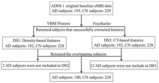 The density features used were acquired from ‘uaspmvbm.csv’, downloaded from the ADNI website (https://ida.loni.usc.edu/, accessed on 3 January 2022), which were extracted from VBM analysis via SPM software (version 5). A total of 116 anatomical ROIs (90 in cerebrum and 26 in cerebellum) were defined using the automated anatomical atlas (AAL) [14]. The CT features extracted by FreeSurfer version 4.3 (http://freesurfer.net/, accessed on 3 January 2022) were acquired from ‘ucsffx.csv’, downloaded from the ADNI website (https://ida.loni.usc.edu/, accessed on 3 January 2022). The thickness values are based on the Desikan-Killiany atlas, including 34 parcels per hemisphere [10].