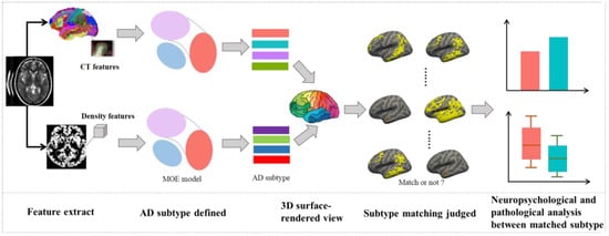 These two morphological measures may be correlated to some extent, where CT measures cortical thinning, and the change in GM density measures a mixed change in local CT, cortical folding, and gyrification. It has been suggested in some studies that CT can drive facilitate the change in GM density [18]. However, most previous studies on AD subtypes definition have focused on only one morphological feature. In our earlier study, four AD subtypes were successfully defined based on the CT features [19], among which each subtype presented its own neuropsychological and neuropathological characteristics. Although several distinct AD subtypes have been identified in most studies, they differ in the definition of AD subtypes, which may be partly attributed to different representative morphological measures [3,19]. This raises a crucial question: How do different GM measurement methods affect the definition of AD subtypes? To answer this question, in the present study, AD subtypes were defined by density-based and CT-based features, respectively, for AD patients from the Alzheimer’s disease Neuroimaging Initiative (ADNI) database. If the matched subtypes could be generated by different measurement methods, the characteristics of matched subtypes will be further explored. To our knowledge, this study takes the lead in comparing the two GM morphological measures in AD subtype definition.