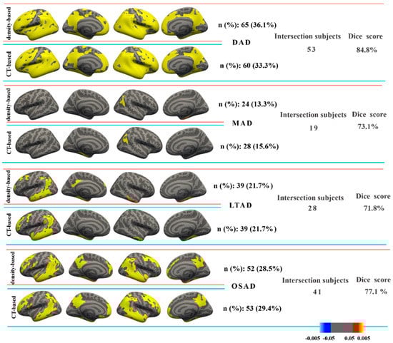 It was noticed that 79.2% of MAD_CT subjects also belonged to the MAD density, while the rest, 20.8%, were assigned to LTAD density. LTAD presented prominent atrophy in the left lateral parietal, middle, and inferior temporal, with the shortest disease duration. Furthermore, it had the least atrophic degree, except for MAD. Many previous studies have reported that the left hemisphere is more susceptible to AD, whose changes are more severe and may precede the changes in the right hemisphere by up to two years [48,49]. Compared with CT measures, the density morphological measures may be more sensitive to detecting asymmetric subcortical atrophy during the early stage of AD.