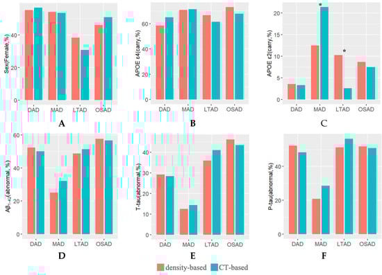 The characteristics of qualitative variables were captured by density features and CT features. The chi-square test was used for comparison between matched subtypes. *: p < 0.05 within the matched subtype. (A–C) The histograms for sex and APOE demonstrate what percentage of AD subjects in each subtype were females and APOE carriers, respectively. (D–F) The histograms for CSF (Aβ1-42, T-tau, and P-tau) indicate the abnormal percentage of AD subjects in each subtype. Abbreviations: AD: Alzheimer’s disease, APOE: apolipoprotein, Aβ1-42: beta-amyloid 1-42, P-tau: Phosphorylated tau, T-tau: Total tau. DAD: diffuse atrophy AD subtype, MAD: minimal atrophy AD subtype, LTAD: left temporal dominant atrophy AD subtype, MAD: minimal atrophy AD subtype, OSAD: occipital sparing AD subtype.