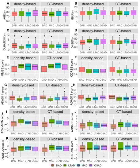 The characteristics of quantitative variables were captured by density features and CT features. Dunnett’s test was conducted comparing the subtypes within each method. (A): Age of subjects in each subtype; (B): Years of education; (C): the duration of AD; (D): the onset age of AD, (E–H): the cognitive scores of MMSE, CDR, ADAS11, and ADAS13; (I–L): the assessments of ADNI composite score. Abbreviations: EDU: education, MMSE: Mini-Mental State Exam, CDRSB: Clinical Dementia Rating Scale-Sum of Boxes, ADAS11: AD Assessment Scale-Cognitive Subscale, which includes 11 tasks, ADAS13: AD Assessment Scale-Cognitive Subscale, which includes 13 tasks, ADNI-MEM: ADNI composite scores for memory, ADNI-EF: ADNI composite scores for executive function, ADNI-LAN: ADNI composite scores for language ability, ADNI-VS: ADNI composite scores for visuospatial ability, yr: year. DAD: diffuse atrophy AD subtype, MAD: minimal atrophy AD subtype, LTAD: left temporal dominant atrophy AD subtype, OSAD: occipital sparing AD subtype.