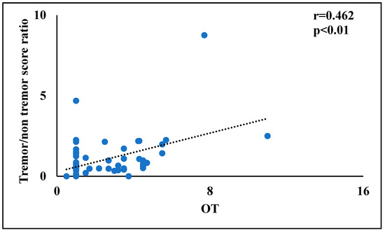 A scatterplot of the relationship between the tremor/rigidity ratio versus the odor threshold in patients with Parkinson’s disease.