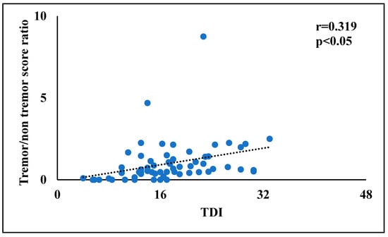 Finally, in order to identify the more promising factors for the multivariate linear regression analyses, bivariate correlations were performed between tremor/rigidity ratio versus motor and non-motor symptoms. In PD patients, the tremor/rigidity ratio was significantly correlated to odor threshold (r = 0.464, p < 0.01) (Figure 1) and TDI score (r = 0.319, p < 0.05) (Figure 2). No significant correlations were observed between the tremor/rigidity ratio versus sex (r = −0.106, p > 0.05), age (r = −0.024, p > 0.05), HY (r = −0.214, p > 0.05), UPDRS (r = 0.115, p > 0.05), LEDD (r = −0.113, p > 0.05), odor discrimination (r = 0.277, p > 0.05), odor identification (r = 0.151, p > 0.05), or cognitive abilities (MoCA) (r = 0.087, p > 0.05).