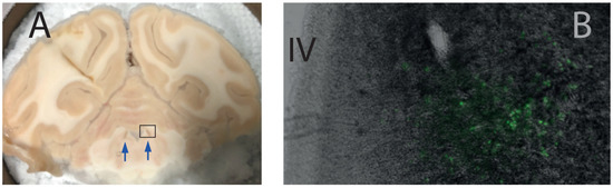 Monkey A was euthanized 63 days after first injection, 54 after second injection. The animal was first anesthetized with Ketamine and then euthanized (Euthazol, IV, 100 mg/kg) under anesthesia with constant monitoring. Right after the animal’s death, it was perfused, first with a solution of saline/heparin for total exsanguination, then with paraformaldehyde (4%) for tissue fixation. After extraction, the brain was cryoprotected by successive immersion in increasing concentrations of sucrose (10%, 20% and 30%). It was then frozen in dry ice and sliced using a microtome into 40 µm sections. The floating sections were then kept in azide solution at +4 °C.