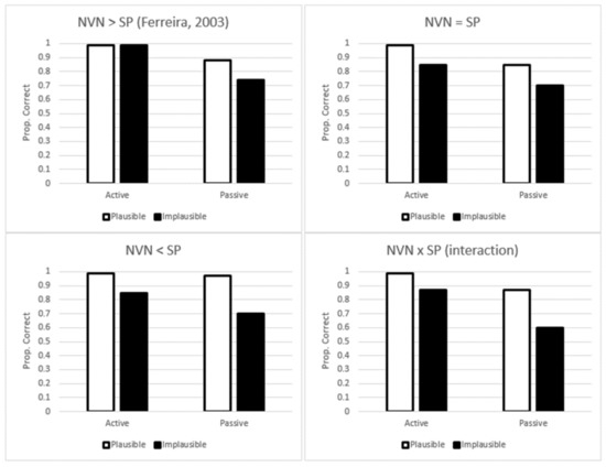 One question that naturally arises is how often participants adopt a good-enough interpretation based on fast-and-frugal processing strategies rather than the full algorithmic parse. Results from the Ferreira [15] study showed that listeners were equally good (and in fact, near perfect) for both active-plausible and active-implausible sentences (see Table 1). However, for passive sentences, listeners committed errors in approximately one out of every five sentences, and there was a clear difference between plausible and implausible passives. The results of Experiment 2 [15] are shown in the upper-left panel of Figure 1, and based on this pattern, Ferreira concluded that the noun-verb-noun strategy is employed more often than the semantic-plausibility strategy. In the other panels of Figure 1, other possibilities comparing the two different processing strategies with one another are shown. However, in order to be clear, we think it is important to work through these differential predictions systematically. With active-plausible sentences (the easiest of the four conditions), neither NVN or SP strategies are assumed to be employed. With active-implausible sentences, participants have the potential for misinterpretations if they go with what was more likely to have happened in the real world (semantic-plausibility). With passive-plausible sentences, participants have the potential for misinterpretations if they assign the subject role to the sentence initial noun phrase and object role to the sentence final noun phrase (noun-verb-noun). Finally, with passive-implausible sentences, the potential for misinterpretation is the highest because both strategies could be employed (i.e., this is the most difficult condition).